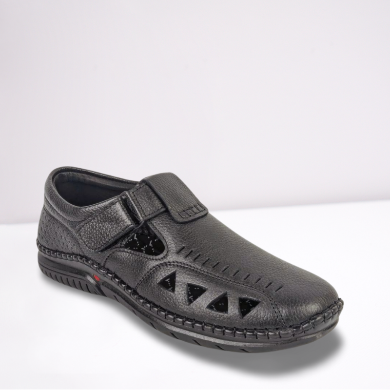 This fisherman style sandal is a lightweight, practical & durable sandal for everyday wear. A velcro fastening strap over instep for easy on & off & fit adjustment, cut outs for ventilation, combined with a smooth leather upper create a distinctive & stylish look.